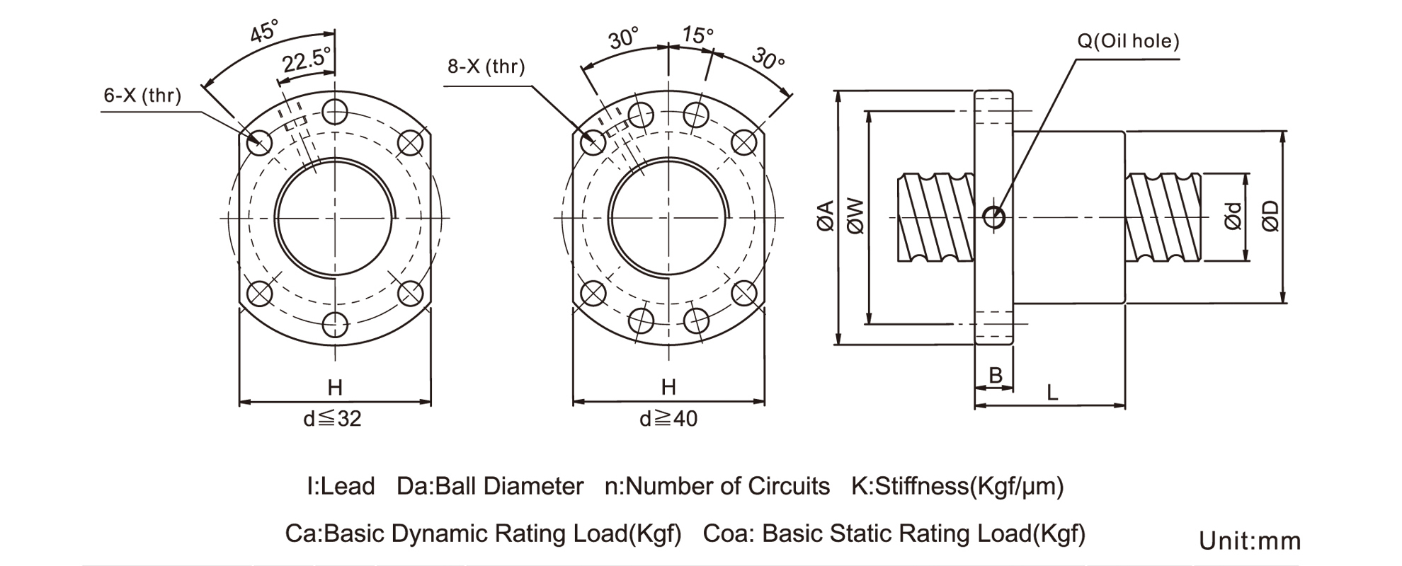 | D | A | B | L | W | H | X | Q | n | Ca(kgf) | Coa(kgf) | |||||